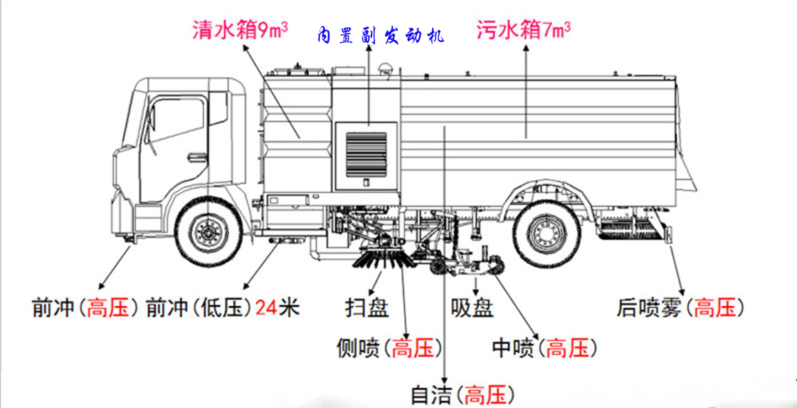 ● 德國高壓水泵(前沖/側(cè)噴/中噴/后噴霧(不銹鋼噴嘴)/側(cè)沖洗/18米高壓卷盤水槍/垃圾箱自潔裝置),清洗能力強(qiáng);萬向高壓路沿清洗,威龍低壓泵(前沖);不銹鋼高壓管路;德國控制器;日本控件開關(guān);美國傳感器;