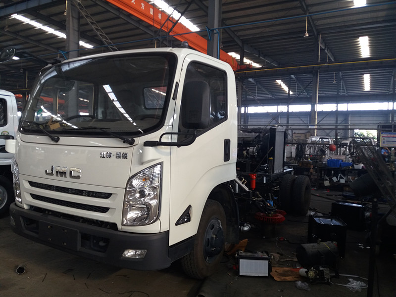 該車采用江鈴國(guó)五二類底盤,加裝副發(fā)動(dòng)機(jī)、風(fēng)機(jī)、垃圾箱、清掃裝置、低壓降塵系統(tǒng)、吸嘴、低壓沖洗系統(tǒng)、清水箱、高壓清洗系統(tǒng)、液壓系統(tǒng)、電控系統(tǒng)等部件改裝而成。