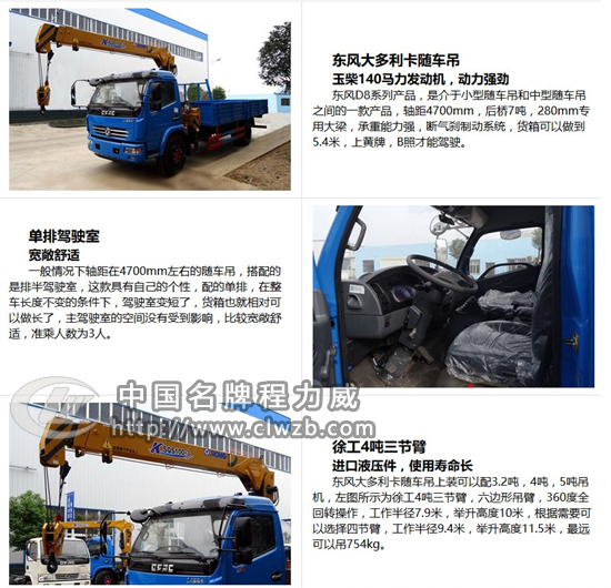 隨車起重運輸車,是一種通過液壓舉升及伸縮系統(tǒng)來實現(xiàn)貨物的升降、回轉(zhuǎn)、吊運的設(shè)備,通常裝配于載貨汽車上。一般由載貨汽車底盤、貨廂、取力器、吊機組成。載貨汽車底盤可選東風(fēng)、解放、歐曼、斯太爾等各噸位。 |